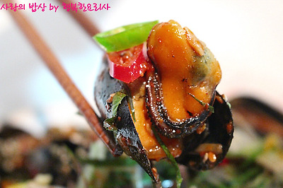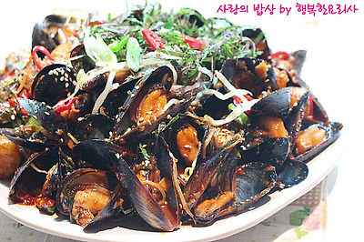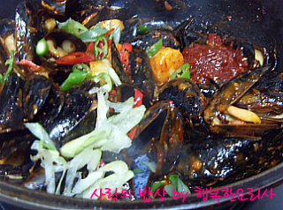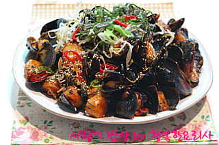 홍합을 넣어 볶다가 양념을 반정도 넣어 볶는다.