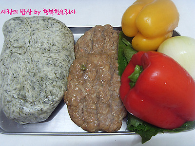 쑥찰떡2덩어리,떡갈비2개,양파(소)1개,깻잎8장,