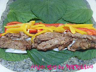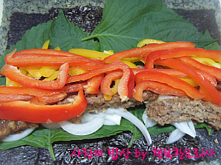 5. 4의 찰떡위에 깻잎을 깔고 양파,떡갈비