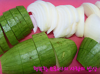 2. 냄비바닥에 깔 애호박과 양파는 두깝게 썰고