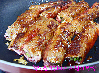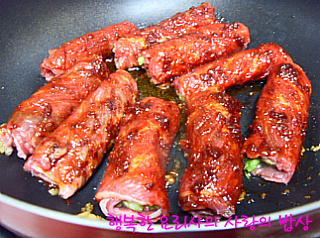 5의 양념 발라진 소고기말이를 넣어 굽는다.