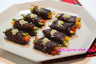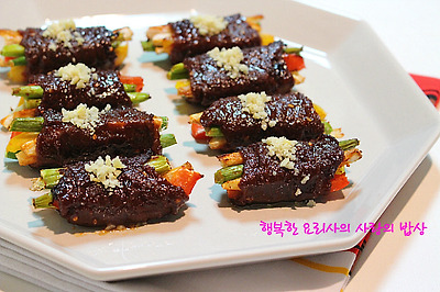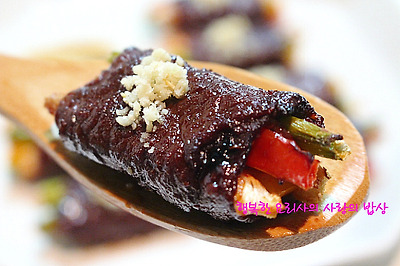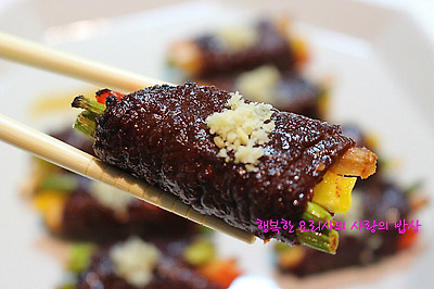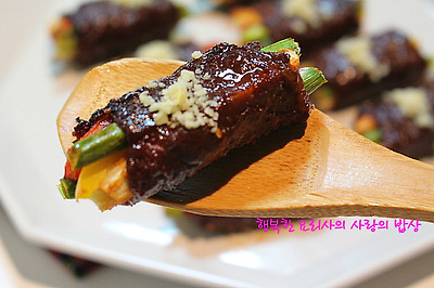 3. 양념 소불고기는 길이로 썰어 위에 더덕,