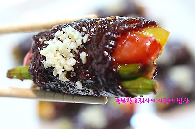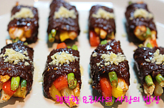 마늘종, 파프리카(빨강 노랑)를 올려 돌돌 만다.
