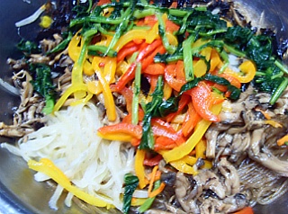 8. 볼에 7의 당면, 데친유채, 양파, 당근, 파프리카,