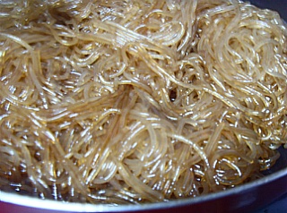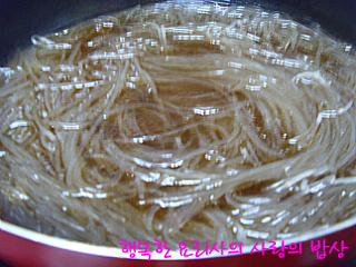 불린 당면을 넣고 삶아 물기를 뺀 후 참기름을 넣어 버무린다.