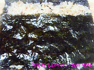 3. 김위에 잡곡밥을 골고루 펴고 반 자른 김을 올린다.