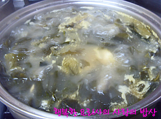 아침 식사로 나온 옥돔 미역국이 눈쌓인 풍경과 함께
