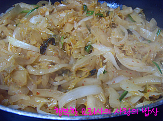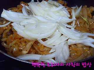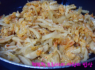4. 팬에 포도씨유를 두르고 묵은지를 볶다가 채 썬 양파,