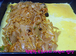 김치볶음을 올려 다른 한쪽으로 덮어 양 끝이 맞닿게 해서 익힌다.