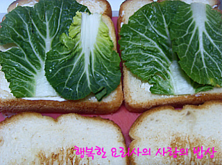 7. 구운 식빵 위에 크림치즈를 골고루 바르고 봄동을 올린다.