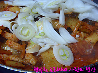 5. 4에 김치를 넣어 볶다가 채 썬 양파, 대파,