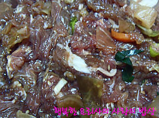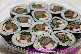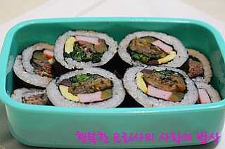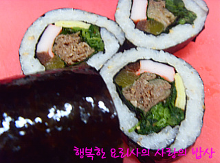 재료: 양념소불고기 600g,김밥재료( 단무지,우엉조림,게맛살,달걀지단),