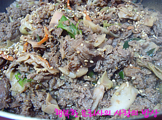 1. 달군 팬에 양념된 소불고기를 볶는다.