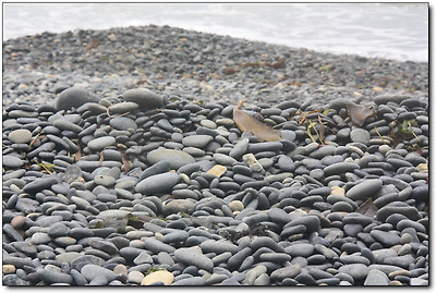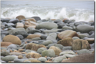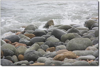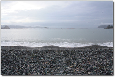 해변에 모래 대신 동글동글한 조약돌이 가득하다.