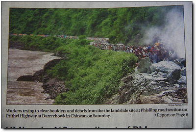 "네~! 여기 좀 보세요. 어제 우리가 가려던 길에 떨어진 바위 사진이 신문에 헤드라인으로 나왔어요."