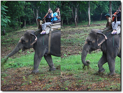 코끼리 등에 올라탄 사람들은 야생 동물들이 나타날 때마다 놀라며 사진 찍기에 바쁜데,