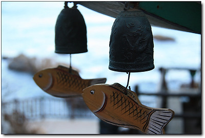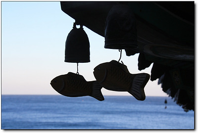 목어(木魚) 두 마리가 처마 끝에 매달려 있다.