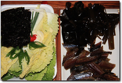아래에 쌈을 놓고 거기다 미나리, 파, 마늘, 고추를 얹고 초고추장도 살짝~! 그리고 제일 마지막에 등장하는 주인공 과메기!! 그리고 입으로 쏘옥~!! 비릿할 것 같았는데, 쌈을 싸서 그런지 하나도 비리지 않았다. 오히려 쌈에 들어간 재료 하나 하나가 제 맛과 향을 내며 어우러지는데, 꼬들꼬들한 과메기의 씹는맛과 고소한 풍미까지 더해져 그야말로 환상적인 맛을 창출했다. 그야말로 겨울철 최고의 별미!! 그 과메기의 맛에 매료되어 울릉도에 가지 못한다는 아픔쯤은 잠시 잊을 수 있었다...