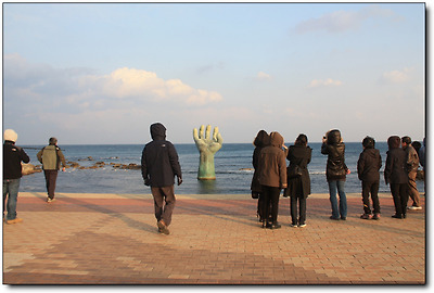 아무래도 바다에 떠있는 오른손이 더 인기가 많은듯~ 추위에 오돌오돌 떨면서도 상생의 손 인증샷 찍는 일엔 모두가 적극적이다.
