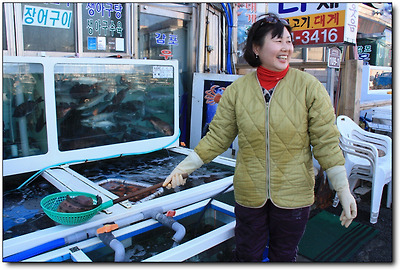 아주머니는 살아있는 물메기를 바로 건져 올린다.