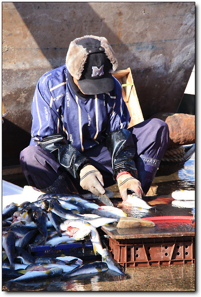 배 옆에선 막 잡아온 싱싱한 생선을 손질하는 손길이 분주하다.