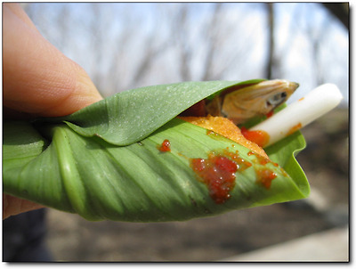 야무지게 싸놓은 나만의 요리, 명이나물 보쌈을 입에 넣는다.