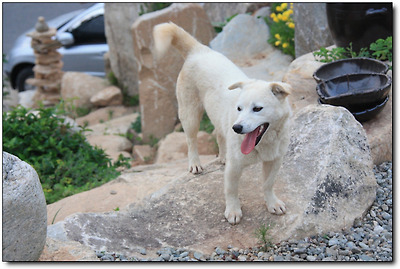 그 옆엔 개 한마리가 꼬리를 살랑살랑 흔들고 있는 모습.