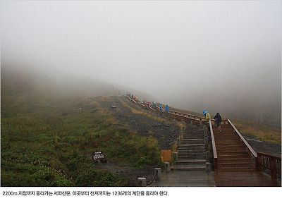 “백두산이 왜 백두산인줄 아세요?” 어떤 조선족 가이드가 뜬금없는 질문을 한다. 분명 책에서 배운 모범 답안을 요구하는 건 아닐 터, 이럴 땐 모른다고 하는 게 출제자의 사기를 올려주는 현명한 처신이다. “글쎄요...” 조선족이 통쾌하다는 듯이 말한다. “백두산은 <백>번 오르면 <두>번 천지를 보여준다고 해서 백-두-산이라고 합니다.” 천지를 설령 보지 못한다고 하더라도 실망하지 말라는 의미에서 만들어낸 그들의 지혜일 터...... 천지를 못 보는 게 그들의 탓은 아닐진대...... 그 이면에 숨은 발상이 예쁘다. 해발고도 2,500m가 되자 일기가 돌변하더니 또 세찬 비바람이 몰아친다. 방한 장비를 완비했음에도 심한 냉기가 엄습한다. 또 이런 날씨라면 천지 조망은.. 여기 북파의 최종 주차장은 해발 2,600m지점이다. 여기까지 소형차량들이 인도한다.