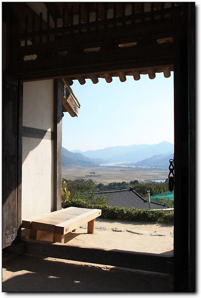 대문 밖으로 저멀리 악양벌에 소나무 두 그루가 한눈에 들어온다.