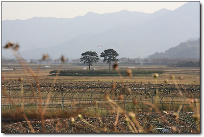 평사리 들녘에 유독 눈에 띄는 두그루의 소나무가 있다.