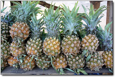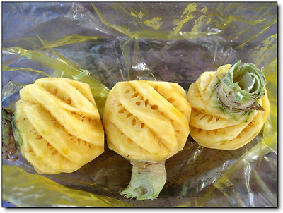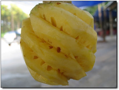 끝부분을 잡고 한입 베어물면 입안에 확 번지는 파인애플 과즙~!! 정말 황홀하다. 기껏해야 통조림 안에 든 파인애플을 먹는게 고작이었는데, 이렇게 싱싱한 파인애플을 통째로 먹게 되다니... 가운데 굵은 심은 그대로 갈비뼈가 되어 마치 갈비를 먹는듯한 기분마저도 든다.