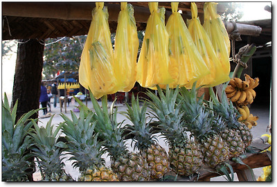 파인애플 위로 노란 봉지가 주렁주렁 매달려 있는데,