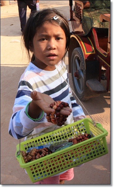 이건 귀뚜라미 튀김?? 호기심에 먹어보고 싶긴한데, 뒷탈이 두려워 그냥 눈요기만 했다. 그런데 차에서 내리면서부터 줄곧 나를 따라다니던 아이가 하나 있었는데, 팔찌를 팔고 있었다. 아이는 한국어를 완벽하게 구사했다. 단,자기에게 꼭 필요한 말만... "3개 1달러~ 예쁘다. 싸다" 그래서 나도 장난으로 받아쳤다. "3개 1달러? 하나도 안 싸다. 그리고 별로 안 예쁘다!!" 그러자 아이는 "그럼 5개 1달러! 언니 예뻐요, 날씬해요." 아이는 장사수완을 발휘한다. 이 아이는 예쁘다는 말, 날씬하다는 말이 정확히 무슨 의미인지 알고 쓰는 걸까? 그 뜻을 알고 쓰는 것이라면 좋으련만, 그저 훈련받은대로 내뱉는 말인 것 같아 씁쓸하다. 계속 외면하자 그 아이가 던지는 결정적 한마디! "나만 못 팔았다. 나만 못 팔았다." 과연 저런 말을 가르쳐준 사람은 누구일까? 차라리 캄보디아 말로 내가 알아들을 수 없는 어떤 말을 간절히 했다면 그 아이를 한번 더 돌아봤겠지만, 고객 지향적 맞춤형 멘트를 완벽하게 구사하는 그 아이가 미워 끝내 외면했다. 버스를 타고 다른 곳으로 이동하는 내내 계속 생각나는 그 아이의 얼굴!! 단순하게 생각하면 재밌는 경험이지만, 깊이 생각하면 그저 웃을 수 만은 없는 풍경이었다.
