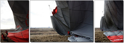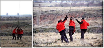 착륙 지원팀이 내려오는 기구를 향해 뛰어온다.