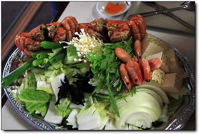 테이블마다 쟁반 가득 놓여 있는 털게 찌개 재료들!