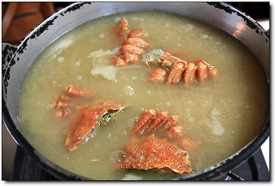 된장을 풀어 끓인 국물에 털게를 먼저 투하한다.