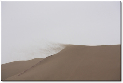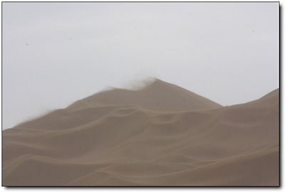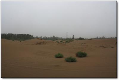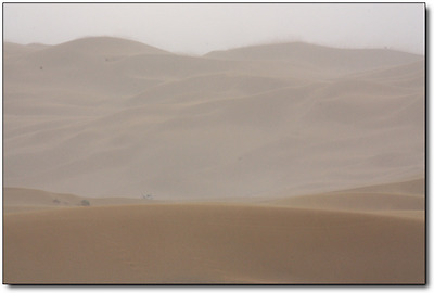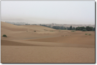 극심한 바람이 분다. 바람이 사막산을 옮기고 있는 절묘한 광경이다. 학자들은 이런 바람을 카라부란(흑폭풍-黑暴風)이라 부르고 누란 왕국이 소멸된 원인을 이 흑폭풍 때문으로 보는 학자들도 있다. 쿠무타크 사막은 이런 바람에 의해 순식간에 지형이 바뀌는 유동사막이다. 여행자들은 좀처럼 보기 힘든 사막산의 이동 모습. 묘한 울부짖음 소리와 함께 살갗을 파고드는 엄청난 모래의 위력. 선글라스와 머플러로는 막아낼 재간이 없다. 이럴 줄 알았다면 방탄용 헬맷이라도 준비해야 했었는데... 하지만 강한 바람을 맞아 출렁이는 모래 파도도 경계인 나무 숲을 넘어 선선 도시로는 한 톨의 모래도 날아가지 않는다니 신기할 뿐이다.