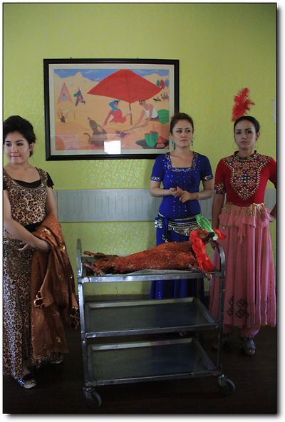 위구르족 아가씨들이 양고기 바베큐를 가지고 들어왔다.