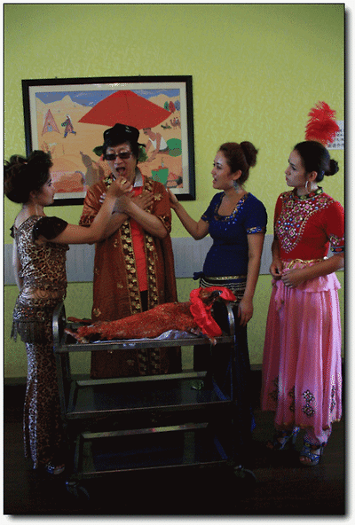 여인들은 그의 귀에, 머리에, 입에 자꾸 뭔가를 꽂는다.