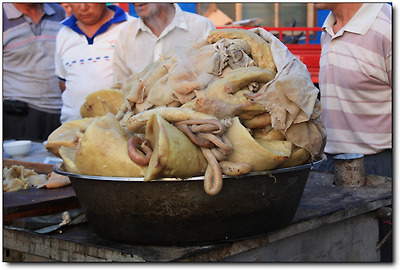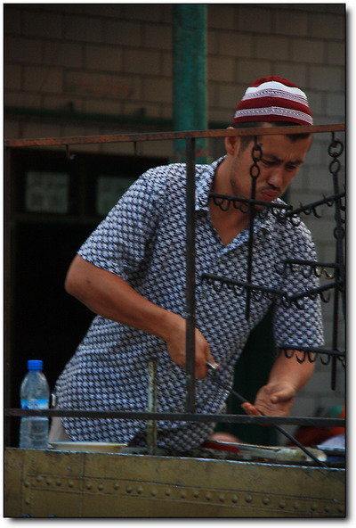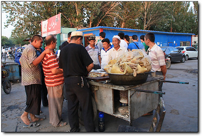 정육점도 아닌데 고기들이 벌겋게 보인다. 자체 발광, 아니 발홍? "커민"의 일종인 향신료 "쯔란"을 입혀서 고기의 누린내를 줄이고 색감을 높였다. 가운데 큰 녀석은 양이고, 얌전히 두 다리를 모으고 있는 건 닭! 모가지가 길어서 슬퍼 보이는 것은 거위인 듯 하다. 그리고 왼쪽에 꿔다놓은 보릿자루인 듯 보이는 것은 생선이다.