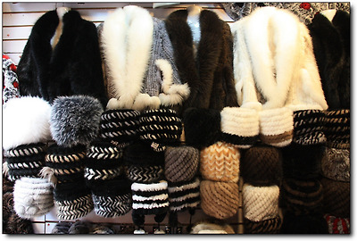 바깥 날씨는 맹렬하게 더운데, 방한복과 방한모자도 팔고 있다.