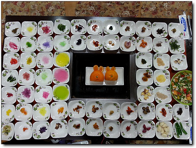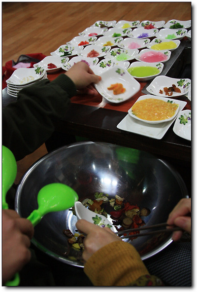 상에서 계속 눈을 떼지 못한 나의 질문!! 그러자 커다란 볼을 하나 갖다 주시며, 지금부터는 작은 접시에 있는 것들을 모조리 여기에 담아 모으란다. 이 아까운 것들을 어떻게...? 하면서도 즉각 행동개시!!