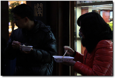 서서 먹을 공간이 있으면 쓰레기통 옆도 아랑곳 않고 만두를 무한 흡입중인 사람들.