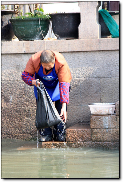 별로 깨끗해보이지 않는 물을 비닐에 길어가고 있는 할머니.