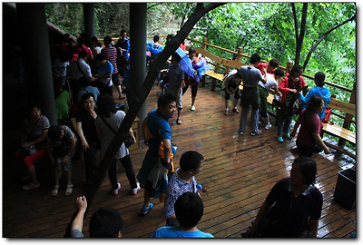 어느 쉼터에 이르렀을 때, 사람들이 내려갈 생각을 안고 가득 모여있다.