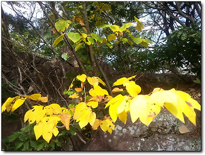 절벽에다 뿌리를 내린 나무들이 가을 색을 눈앞까지 나부끼고.
