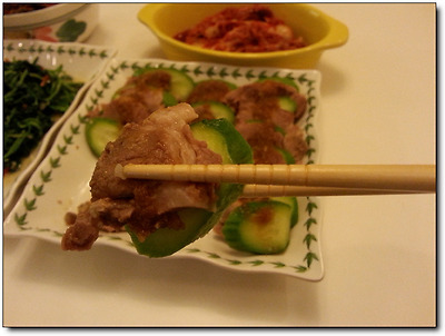 이렇게 고기 한 점에 오이 한 조각을 얹어 함께 먹으라고 알려주시던데,