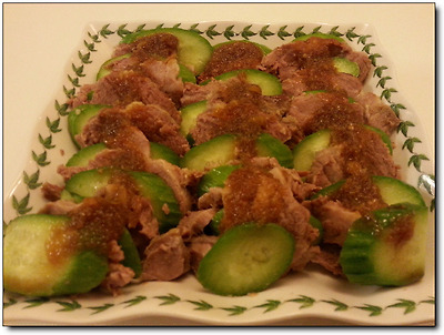 압력밥솥에 고기를 삶아 새콤달콤한 양념 소스를 얹은 수육!