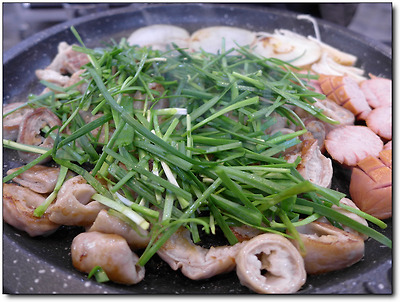 불판이 뜨거워질즈음 부추를 살짝 얹어 바로 먹으면 끄읕~