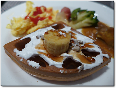 와플에 크림 얹고 달콤한 시럽까지 살짝 얹어 먹으니...
